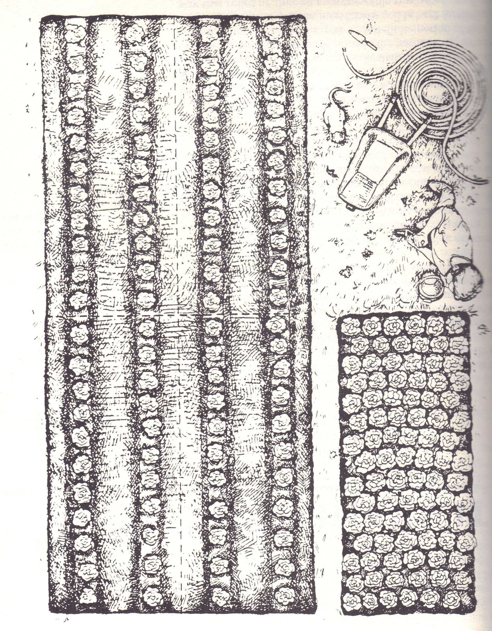 The above shows two different styles of growing: traditional row growing and the biotensive growing method. You can see in the image that the biointensive method uses less space for the same amount of plants! Not only is space better utilized, but using this method, you will use less water, and have less weeds to clear out! Other benefits are: