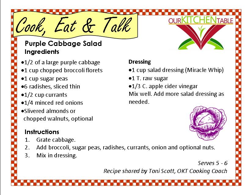 Our Kitchen Table’s Cooking Coach, Toni Scott, has been cooking up a healthy storm throughout the community. Don’t miss your chance this month to learn more about cooking healthy, easy and inexpensively for your family. This month’s menu includes Purple Cabbage Salad and Carrot Juice.Toni is leading a fun cooking demo, tasty sampling and a chat about eating and living healthy.
