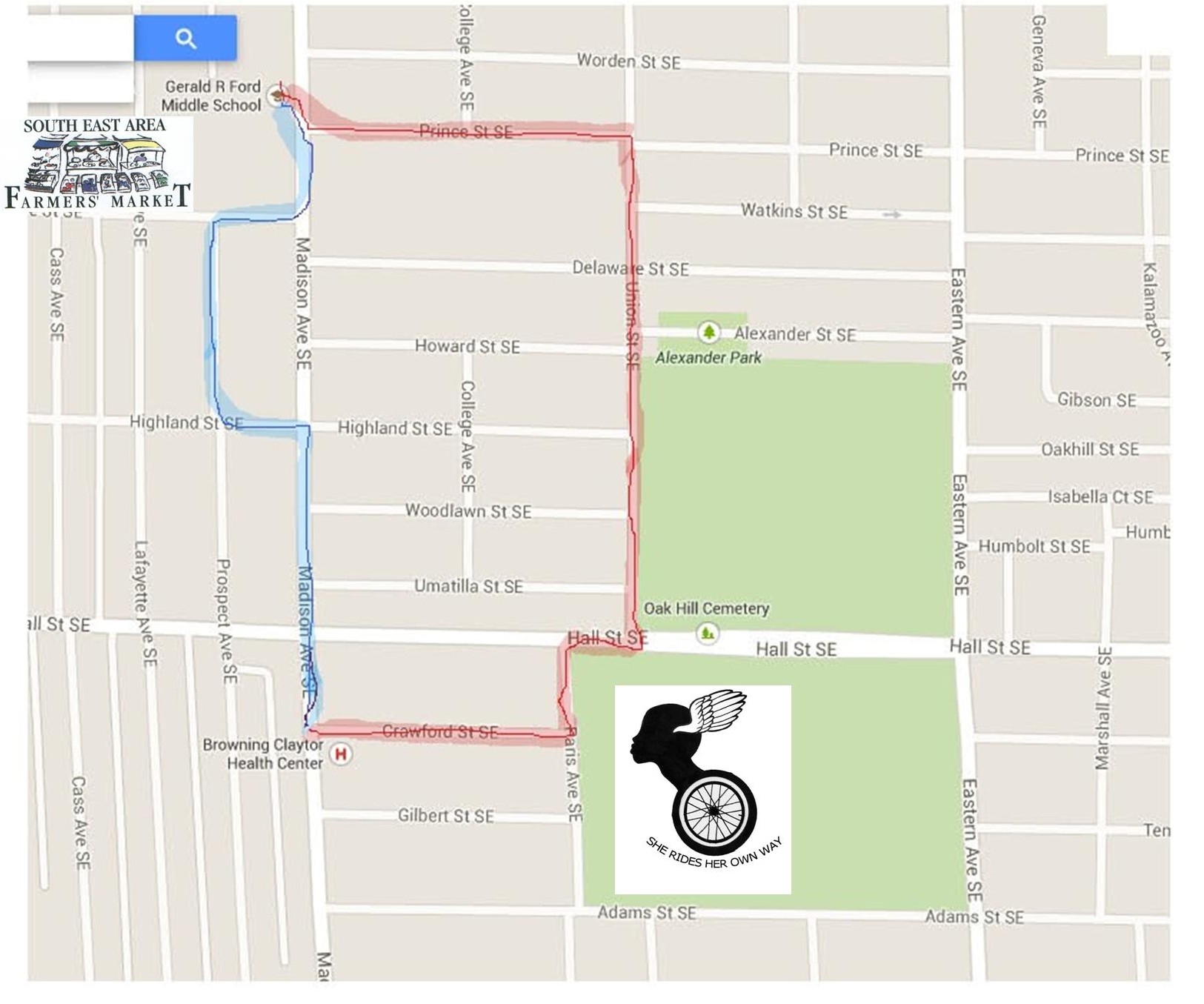 The bike “Ride to Market” starts at 11:30 a.m. Saturday at Browning Claytor Health Center, taking the red route to the Southeast Area Farmers’ Market. After enjoying special activities at the market, cyclists will take the blue route back to Browning Claytor around 2 p.m..