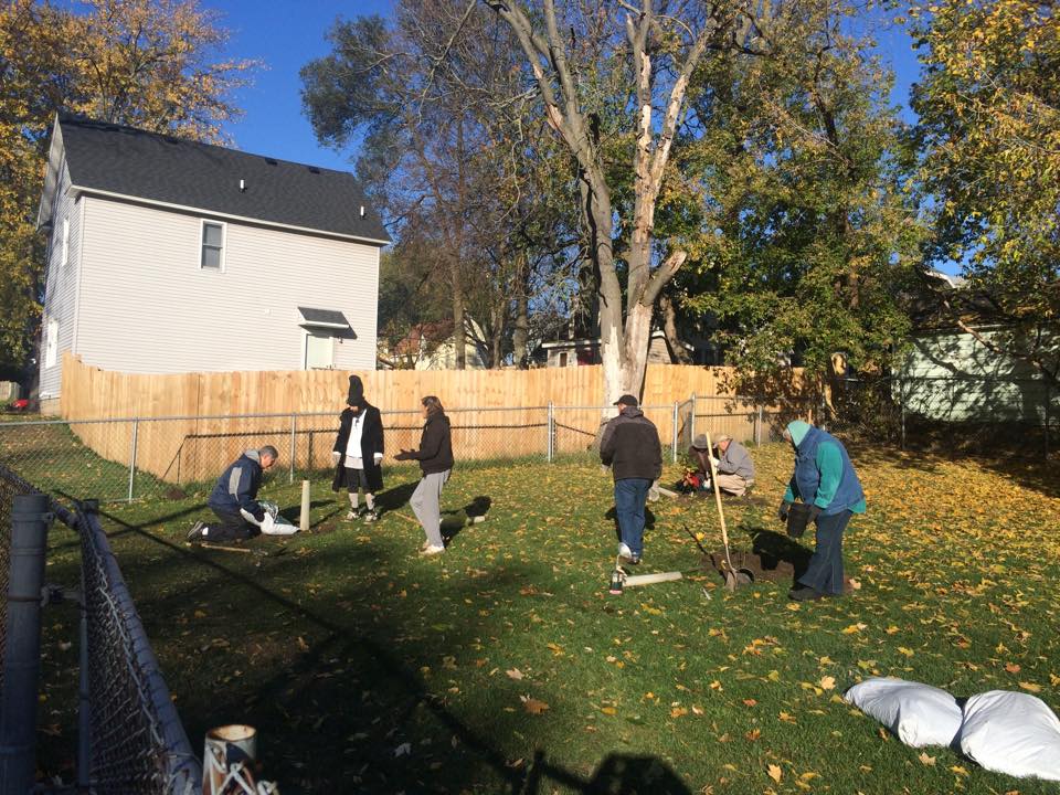 On Saturday Nov. 1, Our Kitchen Table’s urban forester, Laura Casaletto, joined a group of volunteers from Friends of Grand Rapids Parks in planting chestnut trees at Alexander Park. Laura shares, ” In a neglected and devalued street of Grand Rapids once thriving with it’s own grocery and large stately homes, Alexander Park took shape years ago when long term residents advocated to gain a public space cobbled together out of the abandoned properties. Now this peaceful play space has a mini orchard of fruit and nut trees. A dozen volunteers showed up to support the beginnings of a permaculture designed to benefit neighbors in years to come with little maintenance. Our Kitchen Table and Yesterdog worked together to feed the cold and hungry crew a good lunch afterwards and hear the latest news about edible chestnuts, urban foraging and sustainable living–and to make some new friends. Long live trees! Long live the feisty spirit of the Alexander residents!”