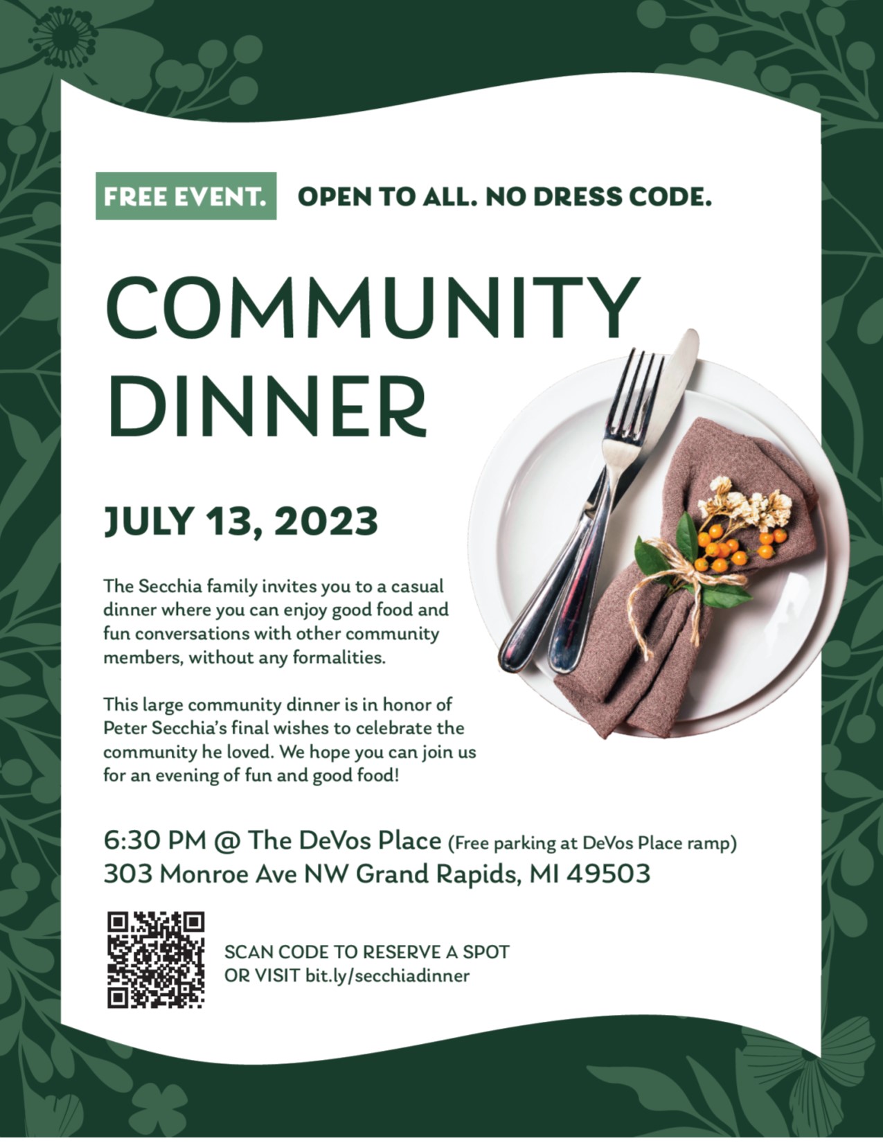 The Secchia family invites West Michigan to a community dinner with no formalities, just good food and fun conversations with fellow community members on Thursday, July 13th at 6:30pm. The event is free and open to all! Free parking will be available at the DeVos Place ramp.