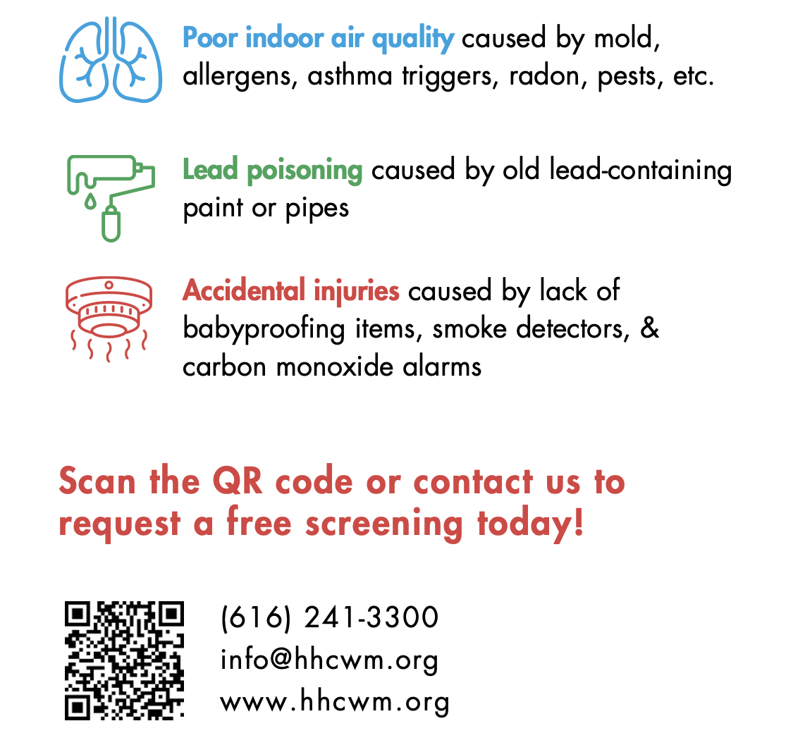 A community-based nonprofit focused on reducing home environmental hazards in Kent County, Healthy Homes serves families and individuals with programming, education, and community conversations. Its vision is that all children grow up in safe and healthy homes. Healthy Homes helps reduce home hazards like: