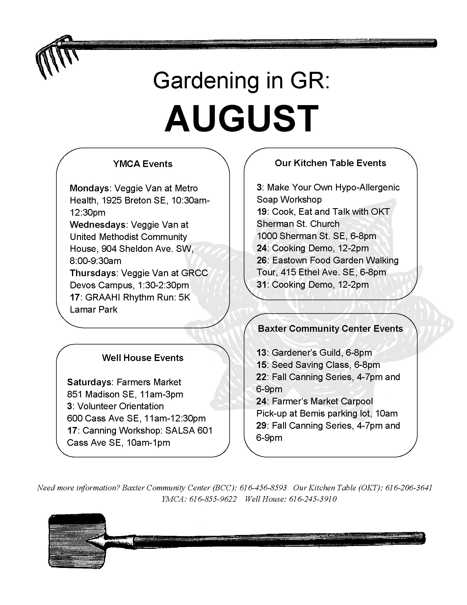 Market partners, Our Kitchen Table, Kent County Health Department and Greater Grand Rapids Food Systems Council have planned a full day music, kids’ activities, cooking demos, health information, dance-exercise and more.