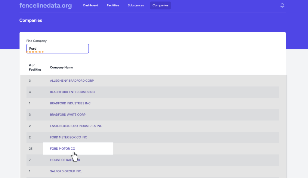 1. Search “Ford” in the “Companies” tab and select “Ford Motor Co”.