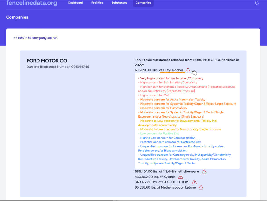 Findings: Ford facilities around the U.S. in 2022 collectively released more than 600,000 pounds of butyl alcohol, a sweet-smelling chemical that can irritate the eyes and cause headaches, dizziness, nausea and vomiting. Ford plants also released more than 586,000 pounds of 1,2,4-Trimethylbenzene, which can affect the eyes, skin and respiratory system, and almost 431,000 pounds of xylenes, which can attack the kidneys and the nervous, respiratory and cardiovascular systems with chronic exposure.