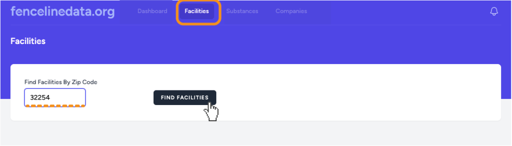 1. Click on the “Facilities” tab. 2. Type in the ZIP code of the facility and hit “Find Facilities”.