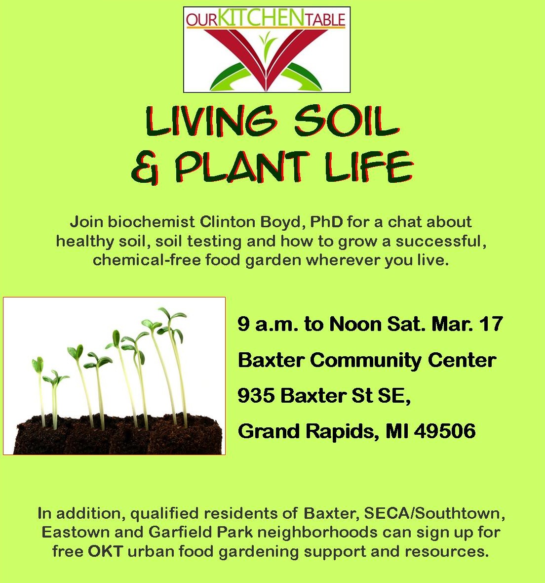 This Saturday, Our Kitchen Table hosts the garden education workshop “Living Soil & Plant Life.” Join biochemist Clinton Boyd, PhD for an enlightening chat about healthy soil, soil testing and how to grow a successful, chemical-free food garden wherever you live.