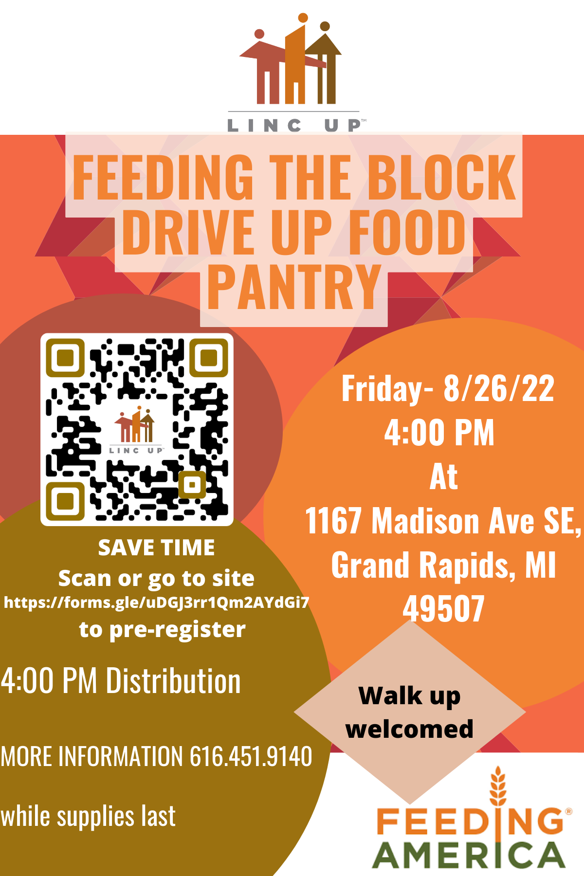 Samika Douglas, a resident of the community, in partnership with LINC UP, will host Feed the Block, a community mobile food distribution event on August 26, 2022. Families will be provided with food, PPE, and other vital resources that they haven’t had access to because of the challenges created by COVID-19. The food and resources will be able distributed in a drive-thru/contactless pick up. Feed The Block will be a fun and uplifting event that will gather between 150-300 community members to build relationships in the southeast neighborhoods of Grand Rapids and connect neighbors to the many resources available tothem. Some of the resources that will be available are connected to housing security, mental and physical health, and COVID-19 education and awareness. Spanish flyer below.