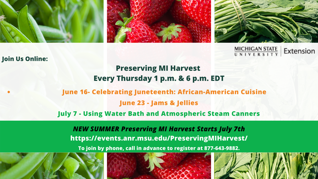 Are you thinking about preserving food at home this summer? Join MSU Extension to learn best practices for safe home food preservation and receive valuable resources to ensure the safety of your home preserved foods.